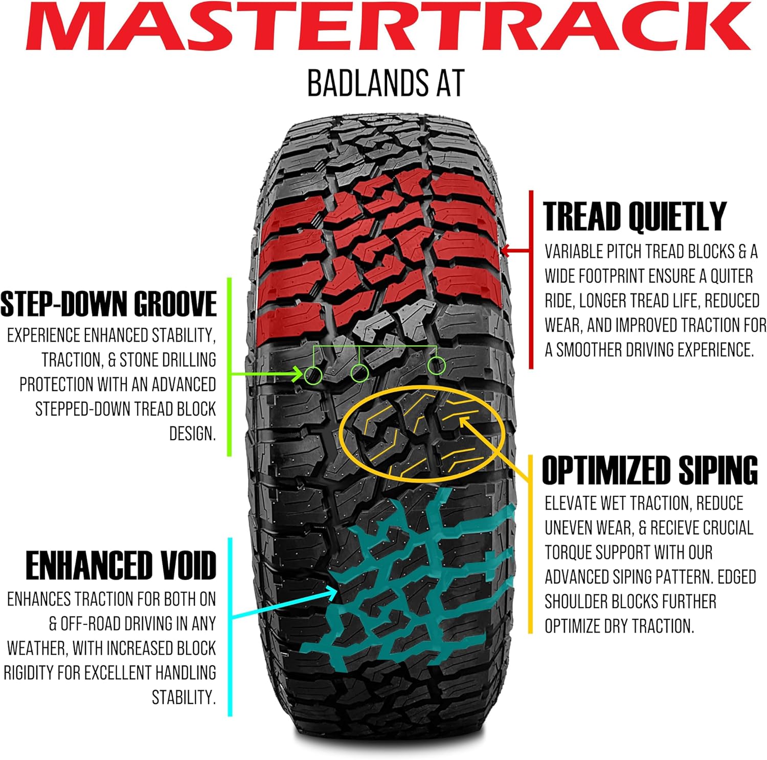 The Mastertrack Badlands AT tire upgrades the all terrain traction by using the tread design.The tread pattern and its circumferential grooves eliminate water and mud from beneath the tire’s footprint, making the tire resistant to dangerous hydroplaning.The flat footprint and the alternating tread block detail work together to optimize the pressure distribution.