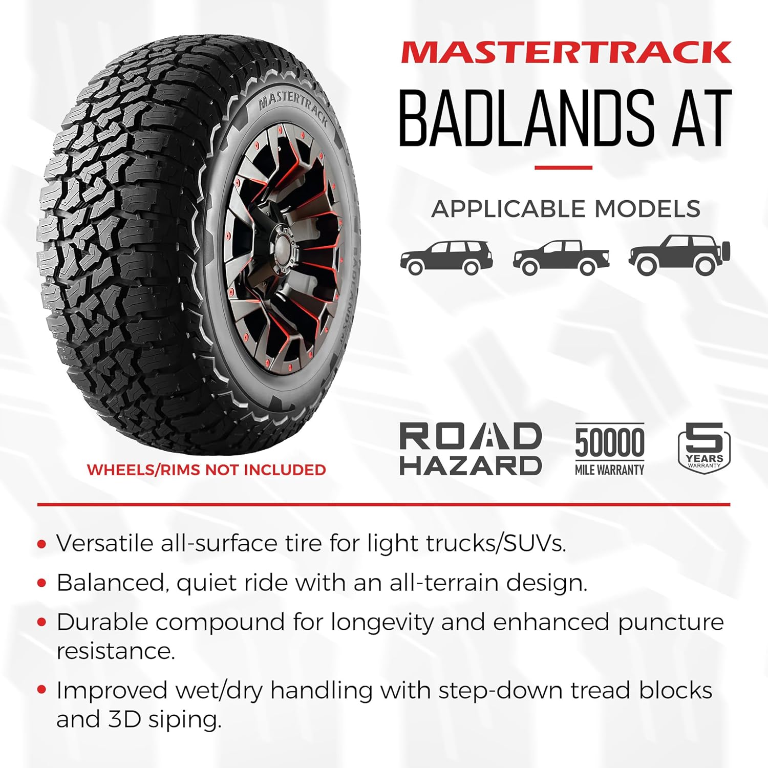 The Mastertrack BADLANDS AT is an all terrain, all-season tire designed for a more comfortable ride with reduced noise. The model are suitable for all terrain and also offers a longer lasting usability.