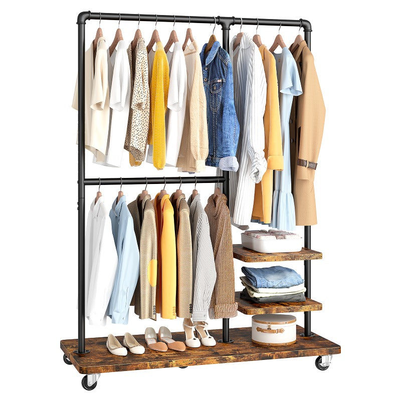 Raybee 620-pound industrial clothes rack is a heavy-duty storage resolution that excels in energy and flexibility. Impressing with its weight-bearing capability of 620 kilos, this rack options double hanging rods and double-layer storage cabinets, making it extremely appropriate for storing heavy clothes in walk-in closets, industrial environments, or business retail areas.